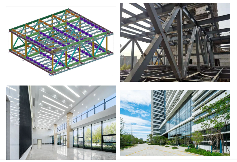 本項目裝配式公共建筑的實踐,不僅僅體現(xiàn)在主體鋼結(jié)構(gòu)上,同時對外圍護系統(tǒng)、內(nèi)裝系統(tǒng)、設(shè)備與管線系統(tǒng)進行集成和創(chuàng)新,成為裝配式鋼結(jié)構(gòu)建筑的典范。在技術(shù)特色方面,該項目充分利用鋼結(jié)構(gòu)的建造優(yōu)勢,讓裝配式建筑與建筑功能、建筑空間、建筑美學(xué)完美融合。在結(jié)構(gòu)創(chuàng)新方面,為體現(xiàn)鋼結(jié)構(gòu)的優(yōu)勢,采用30m*28m的無柱大空間,同時利用斜支撐展示鋼結(jié)構(gòu)的結(jié)構(gòu)之美。在施工過程中,此區(qū)域空間底板和頂板采用桁架鋼筋樓承板,免支模底板也為裝配化施工提供便利條件。在維護結(jié)構(gòu)創(chuàng)新方面,圍護系統(tǒng)使用金屬和玻璃幕墻體系,解決了鋼結(jié)構(gòu)外圍護體系的難題,金屬材質(zhì)的使用,為高層建筑外裝提供了良好的選擇條件,同時金屬板的性能卓越,隔熱、隔音、防水、防污、防蝕性能優(yōu)良,無論加工、運輸、安裝、清洗等施工作業(yè)都較易實施。在裝飾裝修方面,公共部位采用干掛陶瓷薄板技術(shù),全面實現(xiàn)管線分離,為建筑的全生命周期改造提供便利條件;部分層間樓板采用了復(fù)合保溫隔聲樓面板技術(shù),為樓地面的裝配式干法施工做出了積極探索。